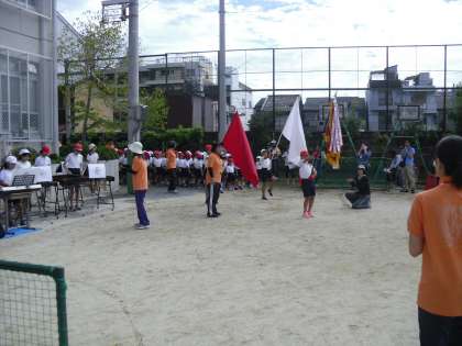 代表の児童の開会宣言により,凛々クラブの演奏で選手入場です。足を上げて胸を張って応援団長を先頭に行進しました。