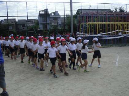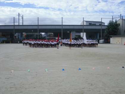 高学年は横の列もさすがに揃います。全員が運動場の南側に揃うと,一斉に本部席に向かって行進です。みんなとてもいい顔をしています。
