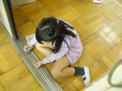 扉のレールの隙間にあるとりにくいごみをぞうきんでこすり取っていました。