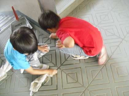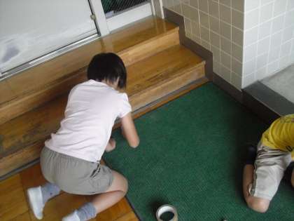 左 タイルの隙間をぞうきんできれいに拭いていました。