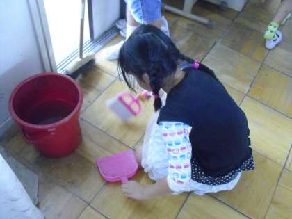 右 隅っこのごみを小さいほうきを使って丁寧に集めていました。