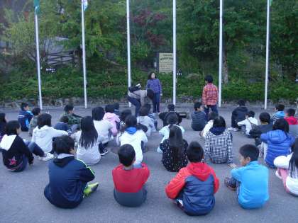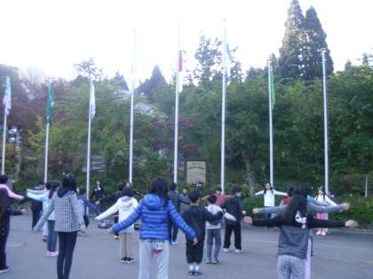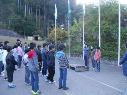 朝の集いです。生活係の子どもが進めています。今日のラジオ体操と朝の暗唱に挑戦しました。