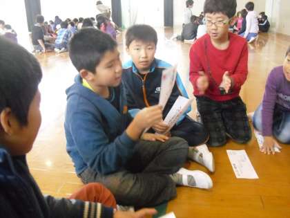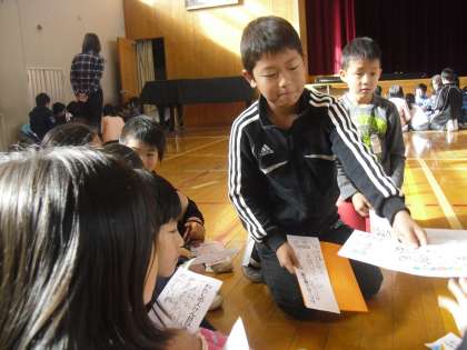 フレンドリーグループでの発表では,ただ聞くだけでなく,感想を発表の児童に贈っていました。双方向の温かい関係ができているのが,朱二校の縦割りグループの素晴らしいところです。