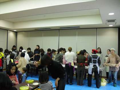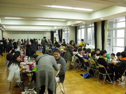 外では,子どもたちが交代して杵を手に餅をついています。中ではPTAや地域の方が餅を丸め,味付けしてお皿に入れてくださいます。味噌汁やお茶もいただき,オープンして30分の多目的室では,大人も子どもも皆,つきたての餅をほおばって幸せそうな笑顔です。