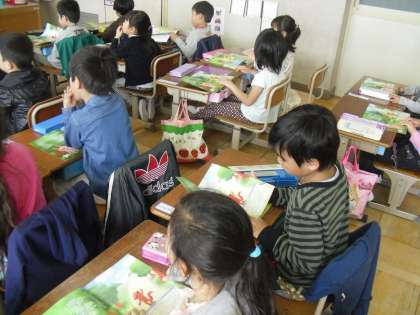 は組の子どもたちも,学級の目標を決め言葉を色画用紙に丁寧に書いていました。1年生も算数の教科書を開け,楽しそうに学習をしていました。