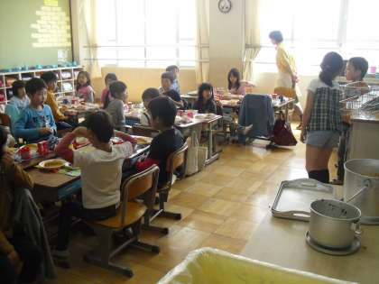 2年生の給食中の様子です。おいしそうに食べています。