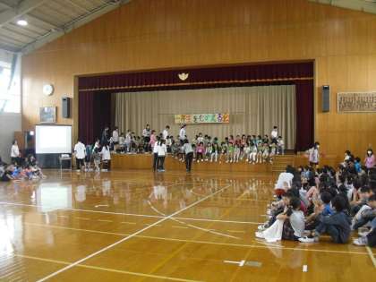 1年生が入場し終わると,迎える会がスタートです。児童会の子どもが,わかりやすい言葉ではじめの言葉を述べました。