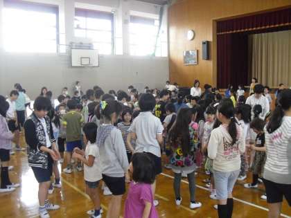 次は,貨物列車です。ジャンケンをして負けたものが,勝った人の後ろにつながっていきます。1年生も含めてみんな楽しく遊びました。