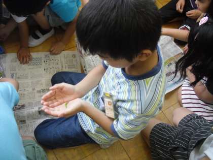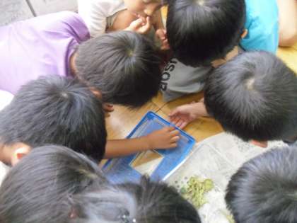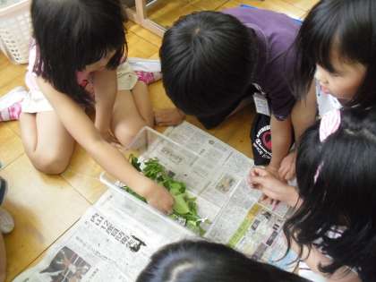 3年生は,理科の学習をしていました。子どもたちが集まっているところを覗くと,モンシロチョウやアゲハチョウの幼虫を観察していました。