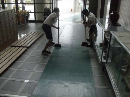 *マットの上を,二人で協力して掃き掃除をしていました。