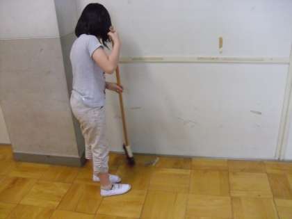 *一人で黙々と廊下の隅にあるゴミを掃き集めていました。