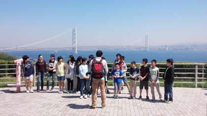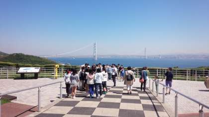 明石サービスエリアに到着しました。明石海峡大橋をバックに記念撮影を撮りました。