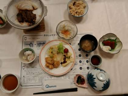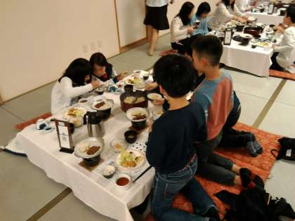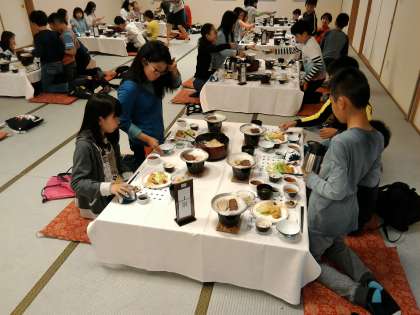 お風呂にも入り、すっきりとしていよいよ夕食です。食事係を中心に協力して味わいます。肉や刺身もあり、大喜びです。