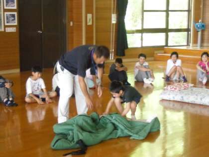 次は,シュラフの使い方の練習です。所員さんと一緒に代表の児童が片付けに挑戦しました。上手にできましたよ。