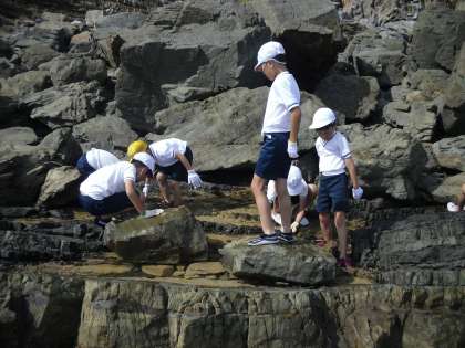 磯観察の様子です。ヤドカリやカニ,イソギンチャクやウニなどいろいろな海の生き物を見つけました。