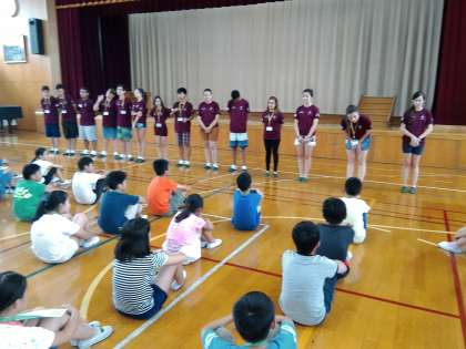 アルモニア学園の生徒は日本語で,6年生は簡単な英語で自己紹介をしました。