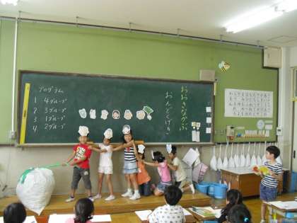 「うんとこしょ,どっこいしょ。」みんなで力を合わせておおきなかぶを抜きました。