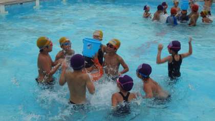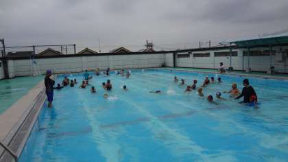 雨もやみ,水温もちょうど。30名を超える子どもたちのにぎやかな声がプールに響き渡っています。おやじの会,PTAの方々に見守られ,楽しいプログラムが進んでいきます。