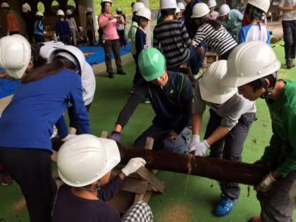 だんだん作業に慣れてきて、直径30センチの太いスギや硬いヒノキの薪割りにも挑戦。皆で交代しながら割っています。一時間弱でこんなに薪ができました。