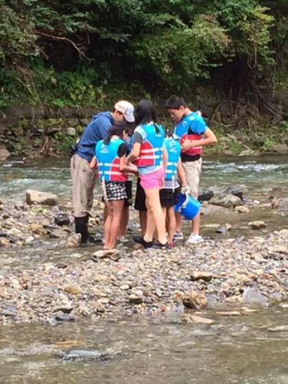 トビゲラ,カワゲラ,ゴリ,カゲロウ,サワガニ‥一人が川の石をどけ,一人が網を構え,一人が足をバタバタさせて追い込むという抜群の連携で,たくさんの生き物を見つけています。