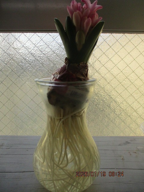 教室の窓辺で育てているダイコン、ニンジンから葉っぱがぐんぐん出ています。また、水栽培をしているヒヤシンスは蕾が大きくなり、花が開きはじめました。素敵な香りが広がっています。