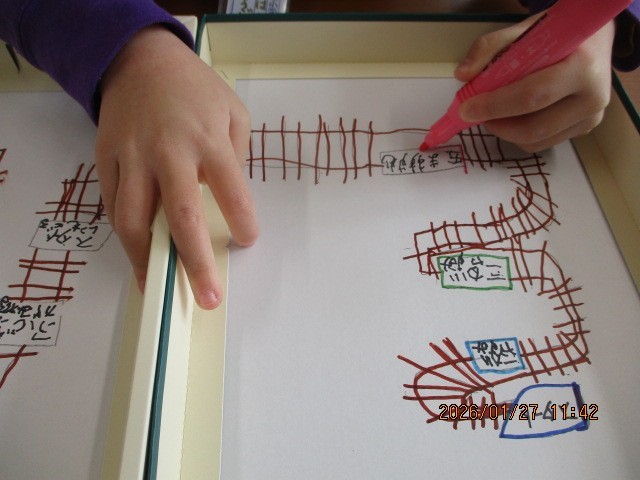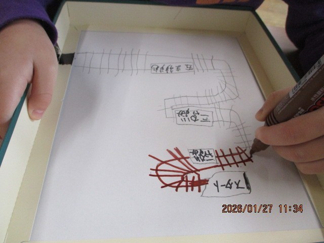 『しんかんせん すごろく』を考えました。京都を出発して東京まで新幹線の旅です。止まった所で〇つ進む。△つ戻る。1かい休み。などの楽しいコースです。また、スタートの京都では、京都タワー、途中で富士山、ゴールの東京では、東京タワーが見えます。できあがったすごろくを友だちと楽しみました。