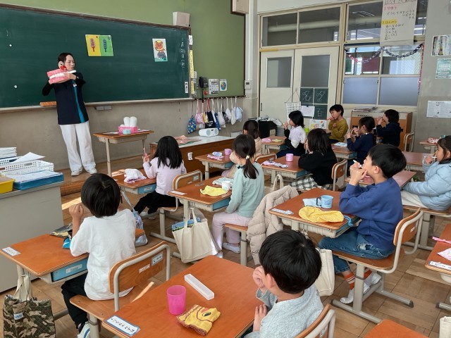 先日、はみがき巡回指導がありました。歯科医師さんと歯科衛生士さんの話を聞いたり、歯のクイズをしていただいたりしました。クイズや話を通して、虫歯にならないために歯磨きがとても大切ということを子どもたちは再確認していました。そして、実際に自分の歯ブラシを使った歯磨き指導では、歯ブラシの持ち方や歯を磨く順番などたくさんのことを教えていただきました。お家でも学んだことを生かして頑張ってほしいです。