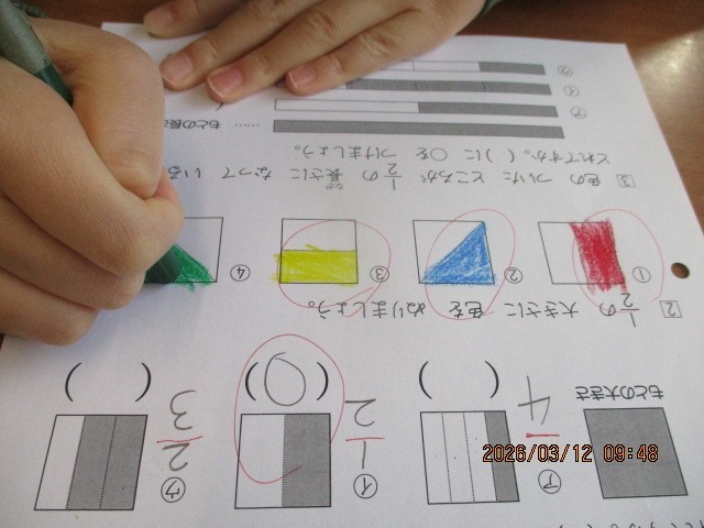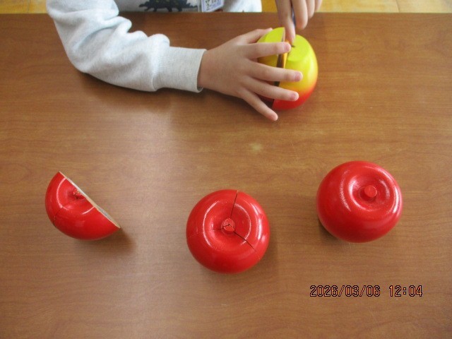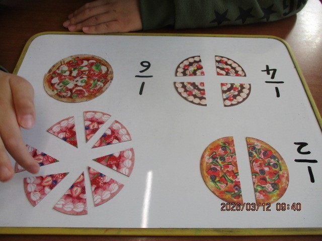 リンゴの模型やピザ・ケーキのマグネット、折り紙を同じ大きさに分けることをしました。また、元の大きさの半分の大きさを二分の一と言い、かき方も学びました。