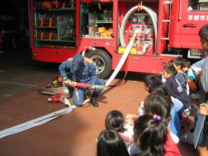 4年生が社会科の学習で,中京消防署に見学に行きました。「消防署の仕事」の学習の一環としていきました。現実に使う道具を見せてもらいながら教えてもらいました。