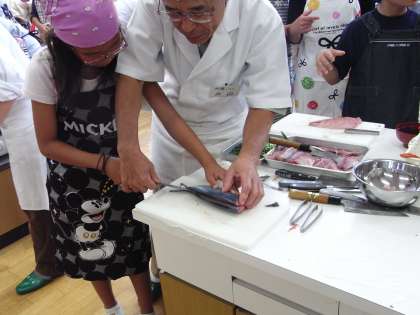 板前さんが各テーブルに一人ついて,丁寧に包丁さばきを教えてくれました。