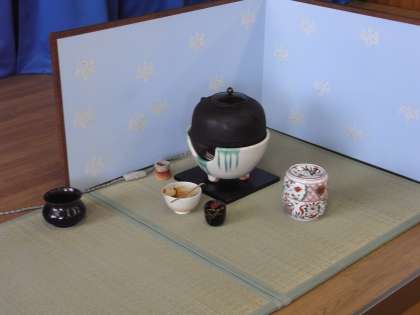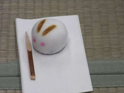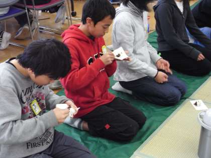 2月15日。本日お点前のご指導に来ていただいた林よし子さまより,茶釜をご寄贈いただきました。三世代にわたって朱三校を卒業されたということで,学校に寄贈してくださいました。大切にして,このような機会に使わせていただこうと思っています。お点前の練習では,実際に立てたお茶をいただき,お菓子も頂きました。今年のお菓子は,うさぎ年なので,このようなお菓子になりました。