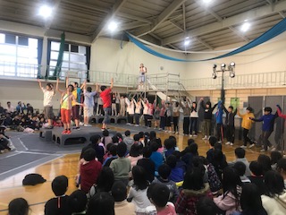12月2日(月)文化芸術派遣事業(巡回公演)で,劇団「風の子」のみなさんに来ていただき,『スクラム・ガッシン 準備完了!第2号計画’(ダッシュ)』の演劇を鑑賞しました。体育館につくられた舞台を全児童が囲むように座り,目の前で演じられる役者さんの声や表情,動作に触れたり,どんどん進んで行くお話のおもしろさや人と人の気持ちの交流を感じたりして,みんながお話に引き込まれていくようでした。一人の役者さんが何役もこなしながら演じられる舞台芸術に触れ,大きな声で笑ったり,真剣に見たり,次々に変わるお話の続きを息をのんで見守ったりしました。5年生も演劇に参加し,舞台を盛り上げてくれました。舞台芸術の楽しさやすばらしさを感じることができました。