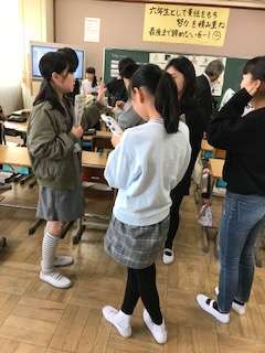 6年の外国語の学習で,自分の将来の夢について,将来つきたい職業やしたいことなど英語でやりとりしながら伝え合いました。なぜその職業につきたいかも伝え合いました。子どもたちは英語でのやりとりや伝え合いを楽しみながら活動していました。また英語でかかれた職業カードを先生の言葉を聞いて,カルタのように取り合う活動にも意欲的に取り組んでいました。