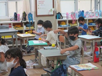 図画工作科の学習で,新聞紙をやぶる活動をしました。できた形を見て,「ぞうに見える!」「向きを変えるとちがって見えるよ!」など,子ども達は想像を広げながら考える姿がたくさん見られました。やぶった形を色画用紙に貼り,作品として今後,残していきたいと思います。