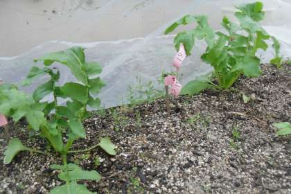 土日が終わったので恐る恐る畑へ行くと…間引きをした芽は,虫に負けることなくぐんぐん成長していました。みんなの気持ちが届きました!成長しているのは,全体の3分の1程度です。(写真1枚目)