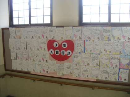 12月の人権月間に,各学年が人権の学習に取り組み,中学年,高学年は人権標語を作りました。各階の学年の掲示板に掲示しています。