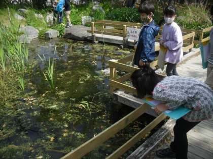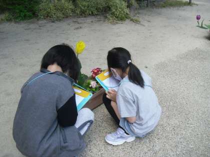 今回の学習では,校庭にいる動物や植物を探すことをめあてに,「生き物さがし」をしました。校庭に出ると,「チューリップが咲いている!」と様々な植物に注目したり,ビオトープへ行くと,「エビがいた!」と水の中の動物を見つけたりする姿が見られました。ぽかぽかと暖かい天気の中,たくさんの生き物を探すことができました。