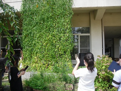 4年生では, 理科の学習でツルレイシの観察をしました。夏休み前に観察した時と比べると, ツルレイシの実が大きくなっていたり, 色が緑からオレンジに変わっていたりして成長が見られました。つるも2階までのび大きく成長しました。