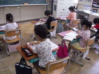 図画工作科の学習ではお話しを聞いたり,読んだりして,思い浮かんだものを絵に表す学習を行っています。