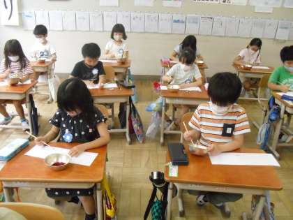 つくった色水に,紙を浸して模様をつくったり,先がとがった割りばしで絵を描いたりしました。とても素敵な世界に一枚だけの色水紙ができあがりました。
