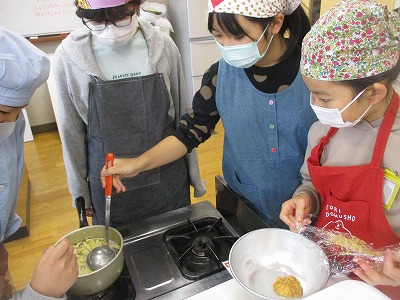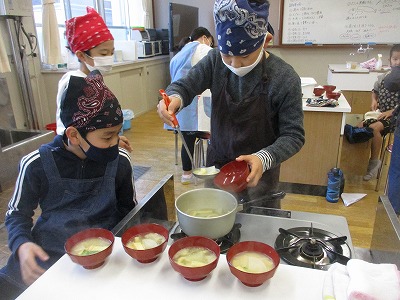 5年生の家庭科の学習では,みそ汁の調理実習を行いました。今回は,にぼしからだしを取りました。にぼしを水に入れて沸騰させると,だしのよい香りが広がり,「いいにおい〜」とだしの良さを感じていました。大根や油揚げを切って煮込んだり,みそを溶かしてだしに加えたりして,作っていきました。3回目の調理実習ということもあり,役割分担しながら,手際よく作ることができていました。おいしく作れて大満足な子ども達でした。今回の学習を生かして,お家でもみそ汁作りに挑戦してほしいなと思います。