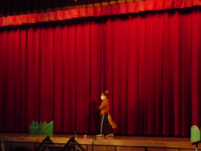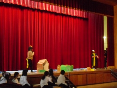 各場面で, 見ている人にどんなことを伝えたいか目標を決め, それをもとにそれぞれのグループで表現の工夫を考えました。最初は, なかなか意見を出すことができなかったり, 思ったようにできなかったりと歯がゆいこともありました。しかし, 教室や体育館で場面ごとに動きや声、音を合わせていくうちに「もっとこうしよう!」「上手くタイミングが合っていなかったからそこをもう一度練習しよう」と仲間と協力しながら活動する様子がたくさんありました。小道具や背景の絵などもアイデアを出し合いながら自分たちで作り, 情景が分かるように工夫しました。