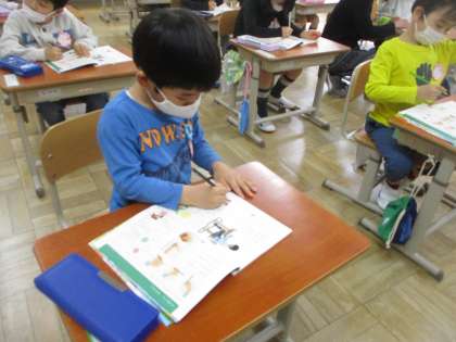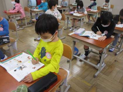 国語科「えんぴつとなかよし」では,正しい鉛筆の持ち方をみんなで確認した後,直線や丸など,様々な形を丁寧になぞりました。1つ1つ時間をかけてなぞることができていました。