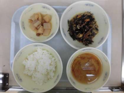 今日は,月に1度の和(なごみ)献立の日です。和食の特徴を知り,味わう日です。メニューは「ごはん」「牛肉とひじきのいため煮」「たけのこのおかか煮」「春野菜のみそしる」でした。たけのこや新じゃがいも,新たまねぎ,春キャベツ,ひじきなど旬の食材をたくさん使っています。