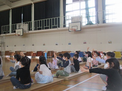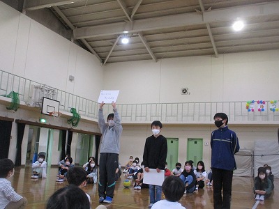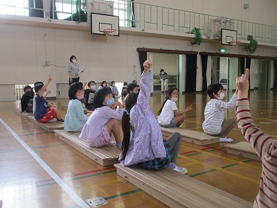 新型コロナウイルス感染拡大防止対策のため,各学年で分散して発表を行いました。1年生の子どもたちは,体育館で各学年の発表を楽しみ,その他の学年も教室テレビに映った中継を見て発表を楽しみました。