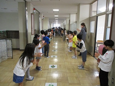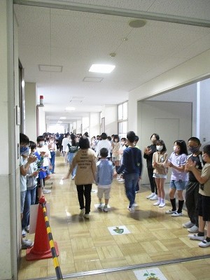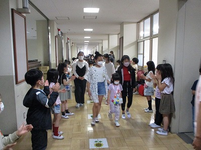 6年生に誘導してもらって歩く1年生に「おめでとう」の気持ちを込めて全校から拍手を送りました。