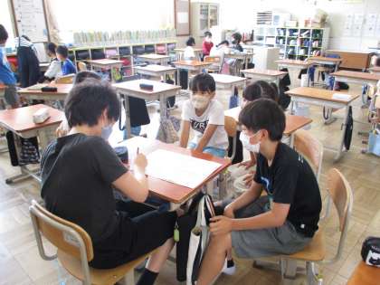 たてわり活動は,1年生から6年生までのそれぞれの学年が1つのグループとなって活動し,『縦のつながり』を深めていく取組です。今回はその第1回目で,各教室に分かれて,はじめての『顔合わせ』をしました。自己紹介し合ったり,1年間の目標について考えたり,どのグループも6年生のリーダーを中心に活動していました。