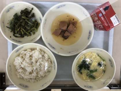 今日の給食は「麦ごはん」「牛乳」「生節のしょうが煮」「だいこん葉のごまいため」「かきたま汁」でした。