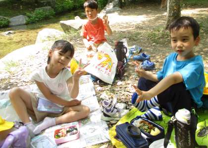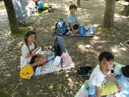 水族館での活動を楽しんだ後,梅小路公園の芝生の木陰でお昼ご飯を食べました。とてもおなかがすいた様子だったので,お弁当を食べるのを心待ちにしているようでした。各クラスの班で,距離をとって食べることができました。