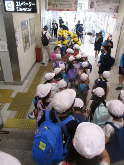 たくさん遊んだ後に少し休憩し,電車で学校へ戻りました。本当に暑い一日でしたが,1年生はよく頑張って活動することができていました。今日の思い出など,お家でたくさんお話ししていただけると嬉しいです。